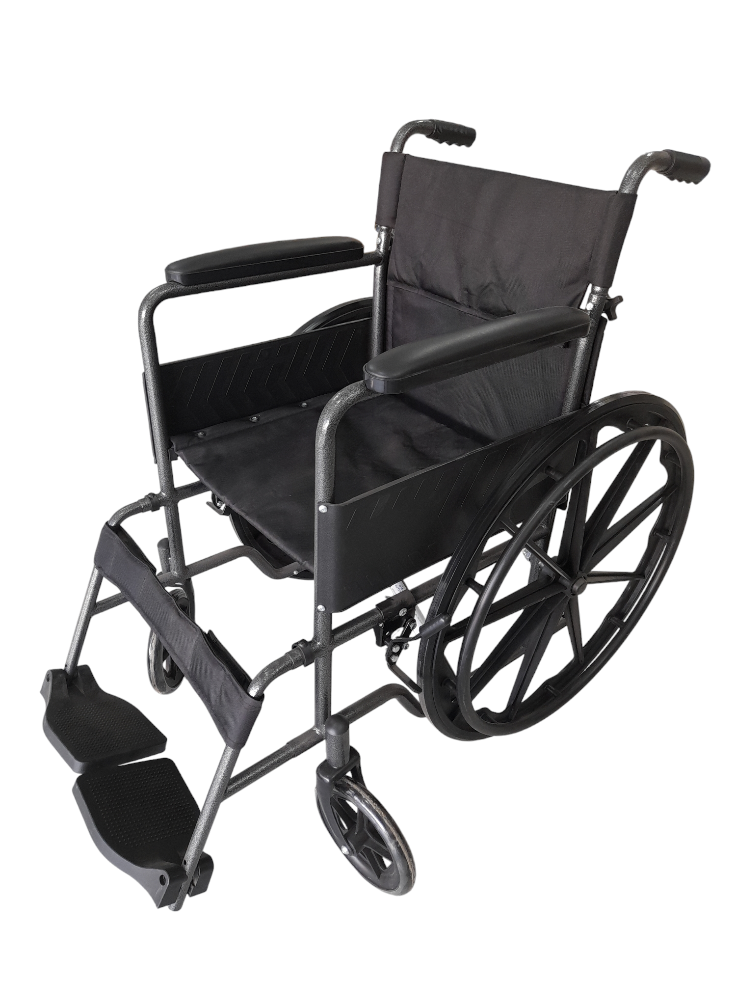SILLA DE RUEDAS ESTANDAR, CAPACIDAD PARA 110KL PLEGABLE CON ESTRUCTURA METALICA RECUBIERTA CON PINTURA EPOXICA RESISTENTE A LOS GOLPES Y CORROSION, POSA PIE REVATIBLE, RUEDAS DURAS CON FRENO.